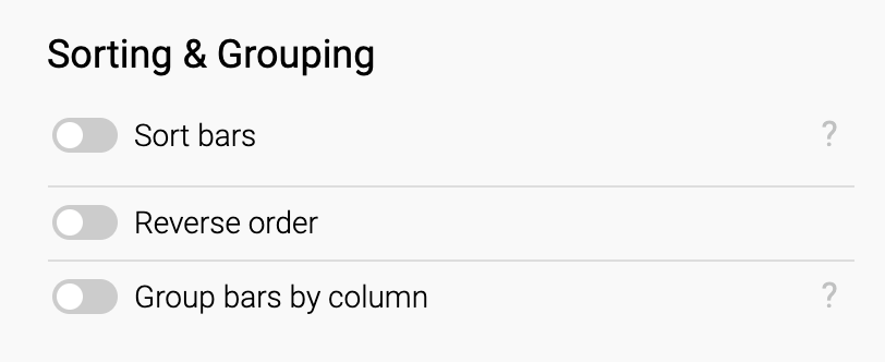 - Group bars by column: You can upload an extra column to put categories into extra groups. In our case, we could have a column that indicates the continents our countries are in. Each row in this column would have the name of the continent in it: "Europe", "Australia", "Asia", etc. If we chose that column as our "Groups", the chart would group all the countries that are on the same continent together.