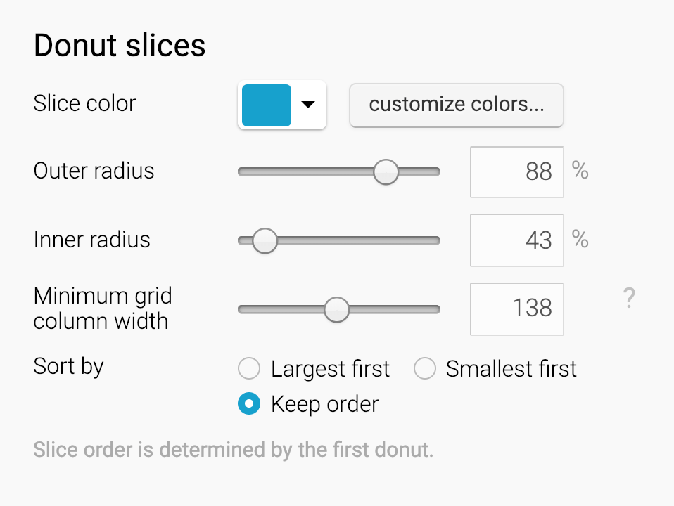 - Sort by: By default, the slices in your donuts are sorted from largest to smallest value (the first donut will be the benchmark for that. So all donut will be ordered like your first donut, even if the first donut slice is only the largest donut slice in this first donut.) Even if your original values are not sorted, the final Multiple Donuts chart will have the slices sorted. You can click on "keep order" if you want to have your donut slices sorted according to your original values.