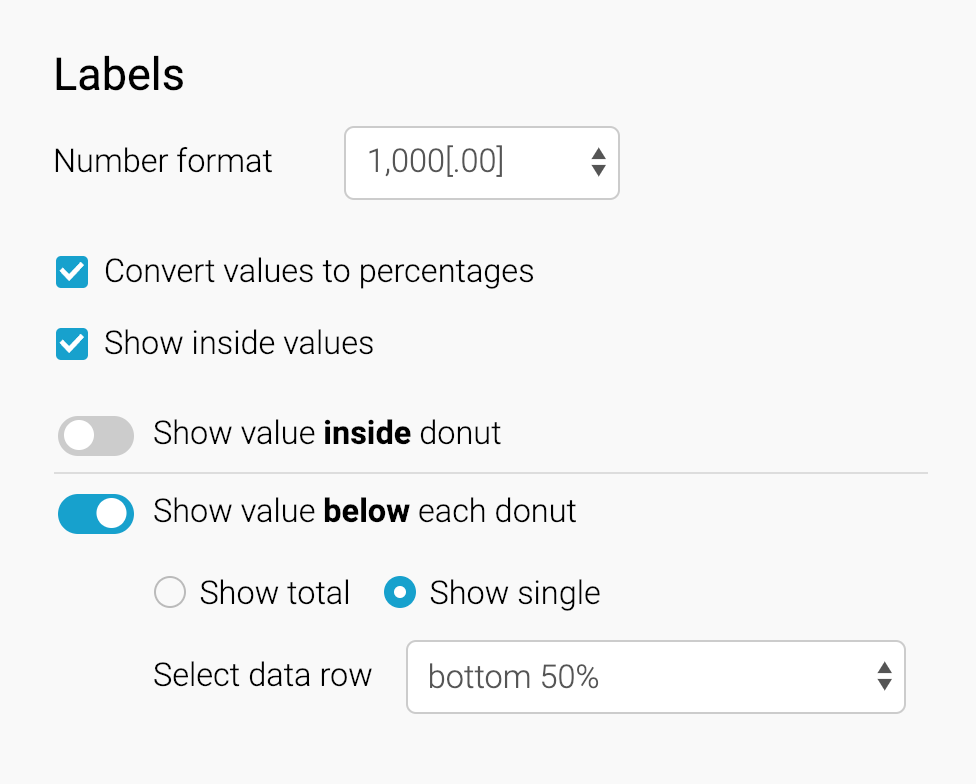 - Show value below each donut: If you turn this feature on, you'll have the same two options: You can display the sum of all donut slice values (if you uploaded relative numbers, that number should be 100%). Or you can decide to emphasize the value of one donut slice within each donut, with choosing "Show single".