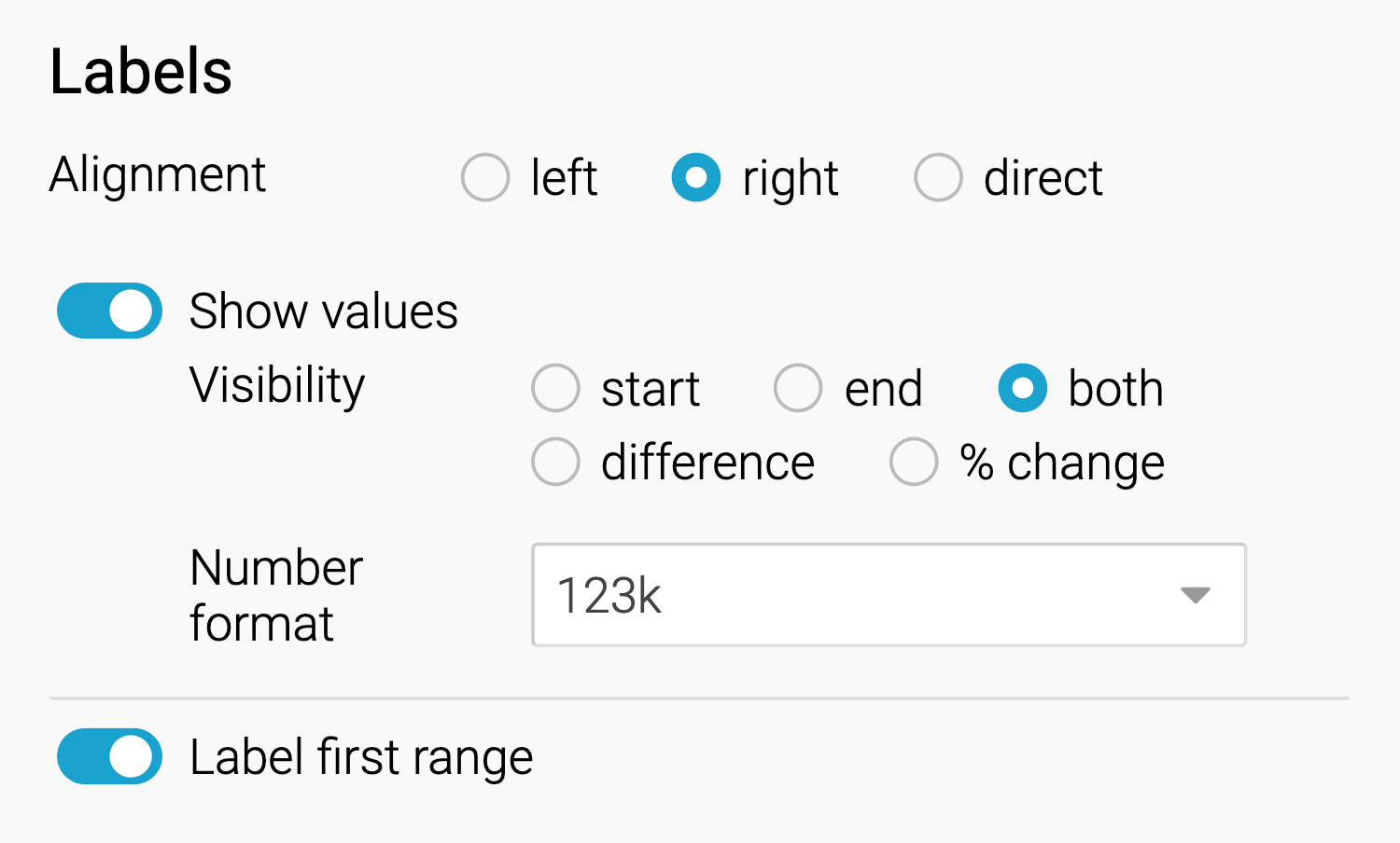 The second panel lets us customize the labels. Here we can choose how you want your labels to look. Do you want your labels to be left or right-aligned? Do you want to show values next to the range plots? The absolute difference or the % change? You can try these different settings out for yourself and see what happens.