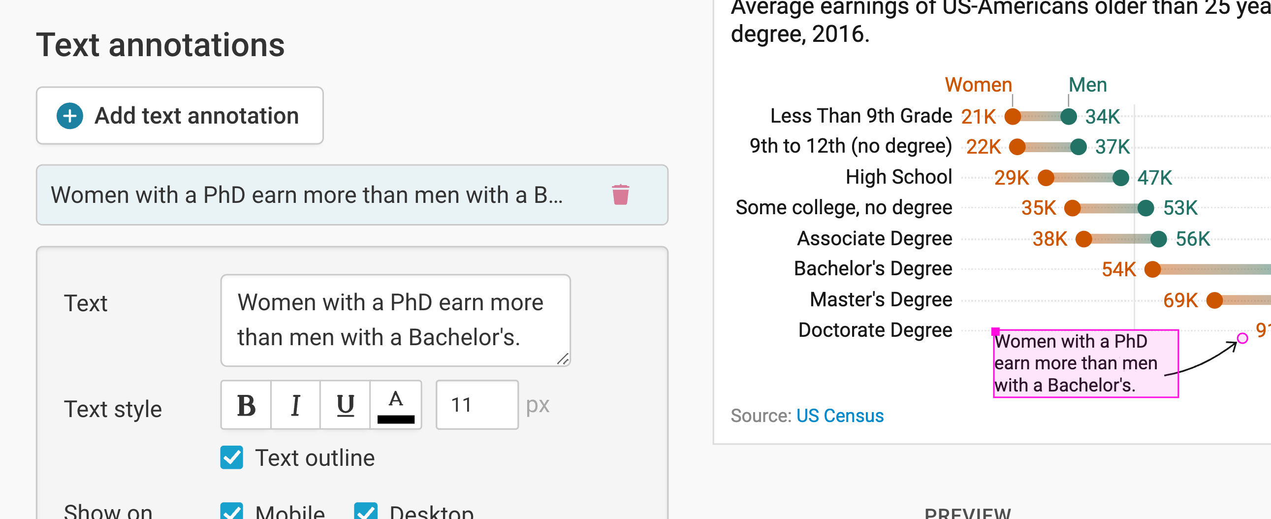 You can add annotations to your range plot by clicking on Add text annotation. You can then style and move the text, add an arrow and circle to it, and adjust how it will appear on mobile. Here's an in-depth explanation of all the options.