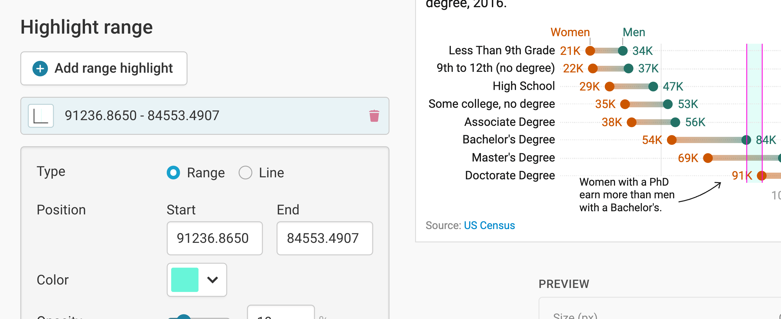 In the "Refine" tab, we see five panels. The first panel lets you customize the range start and the range end by selecting one of the numeric columns. In the case of our chart, we want to show the pay gap between Women and Men so we set the range start to "Women" (women's average earnings) and the range end to "Men" (men's average earnings). It can also be the difference between dates, percentage points, etc.