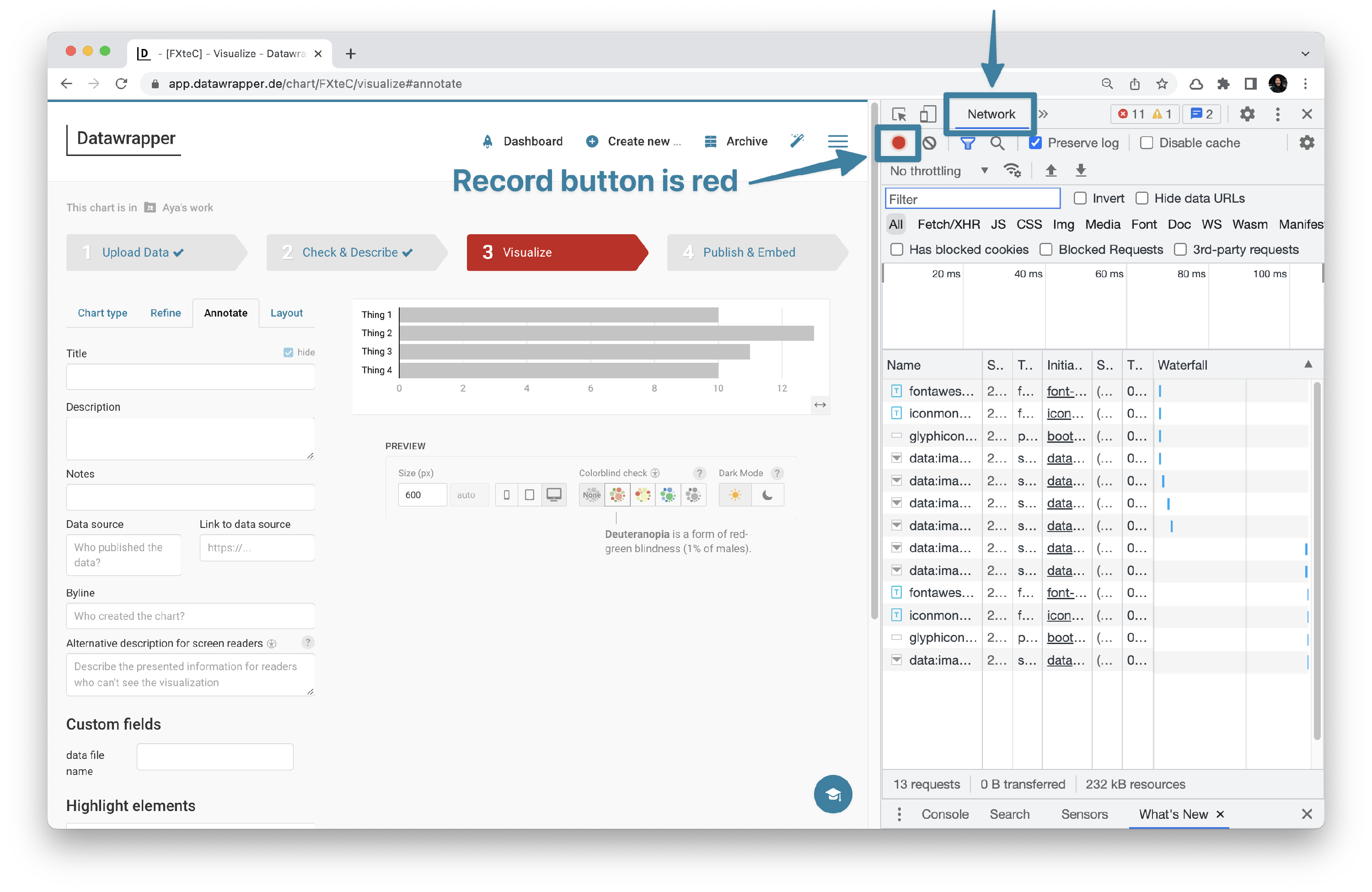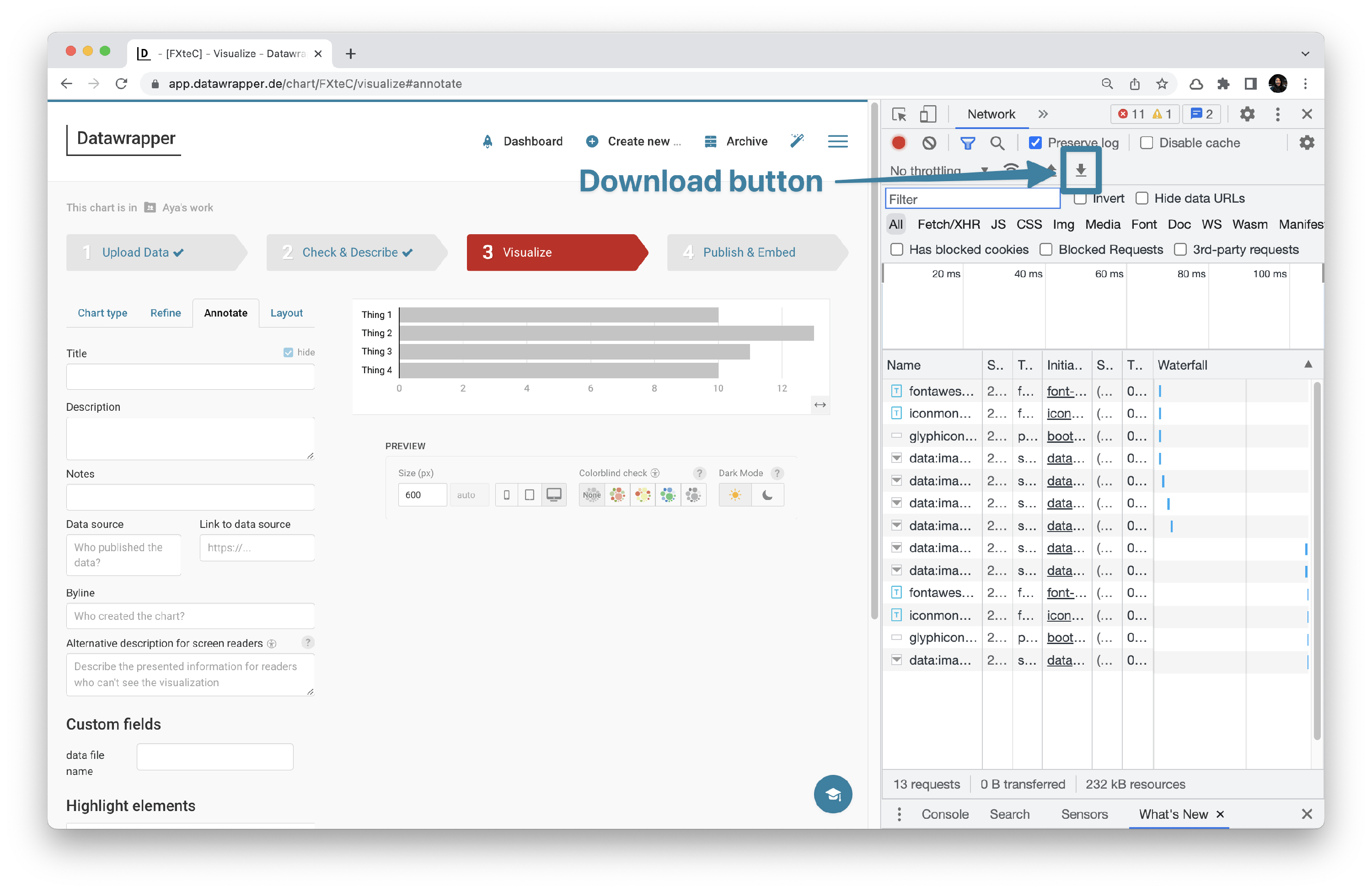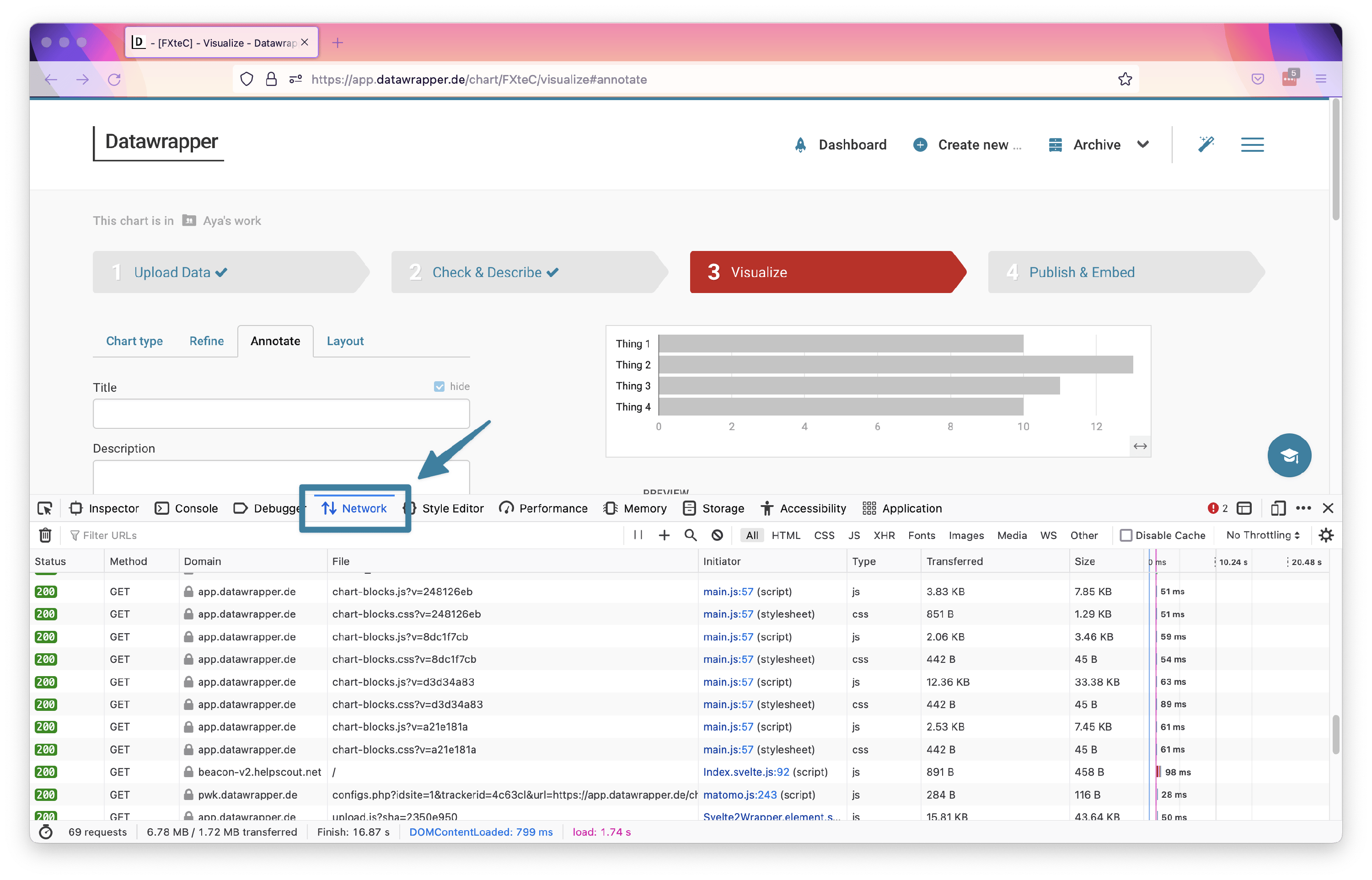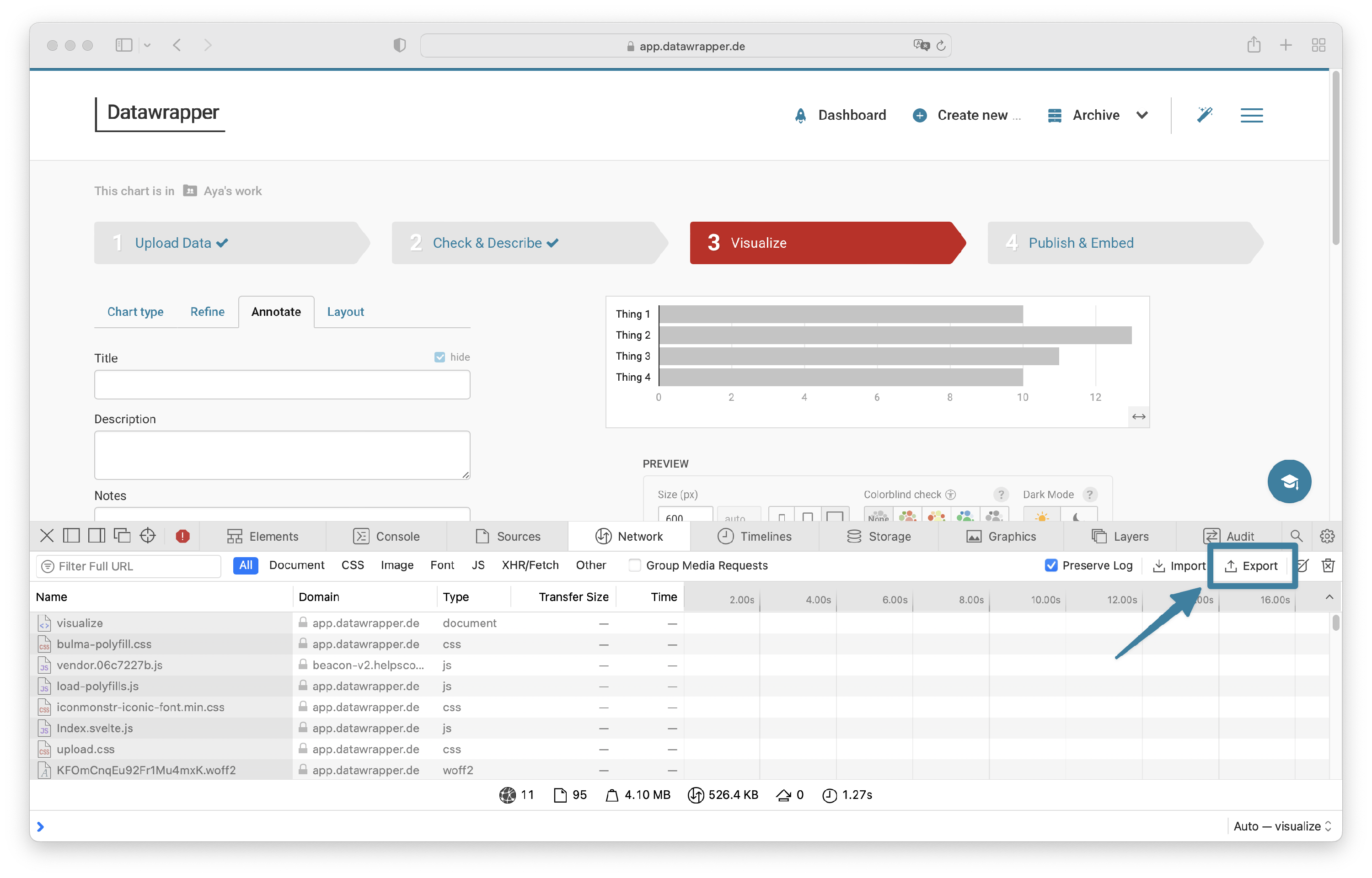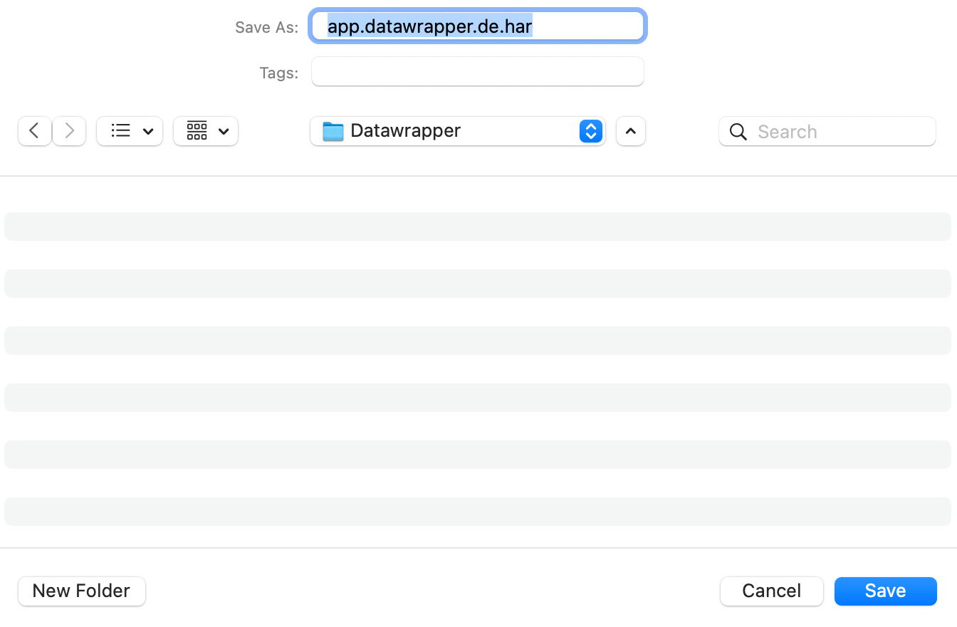 we may ask you to export a HAR file from your browser’s developer console. The HAR file will contain helpful information about the communication between your browser and the Datawrapper app, including any errors.