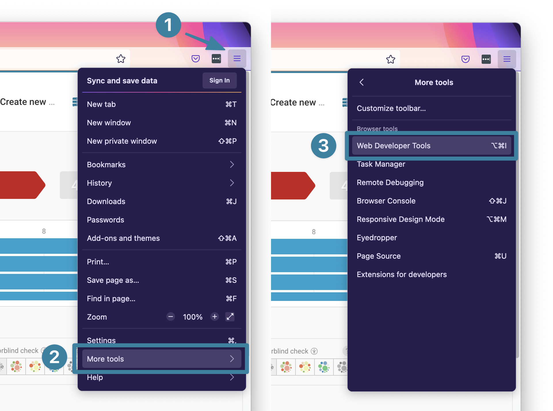Open the Developer Tools by clicking on the ☰ menu on the top-right corner > More tools > Web Developer Tools