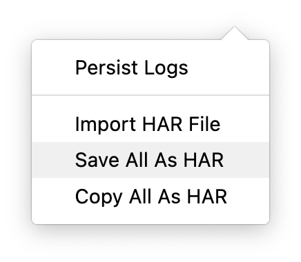 After you’ve seen the issue appear, export the HAR by clicking on the wheel icon and select Save All As HAR