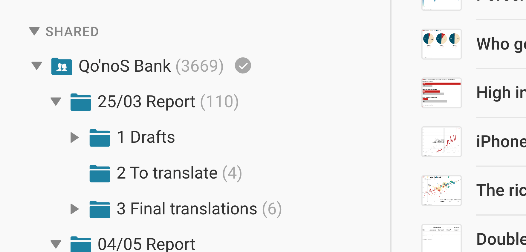 As soon as you've created more than a few charts and/or are working together with others in teams, you'll need to organize your charts. Here are some ideas on how to organize your visualization archive.