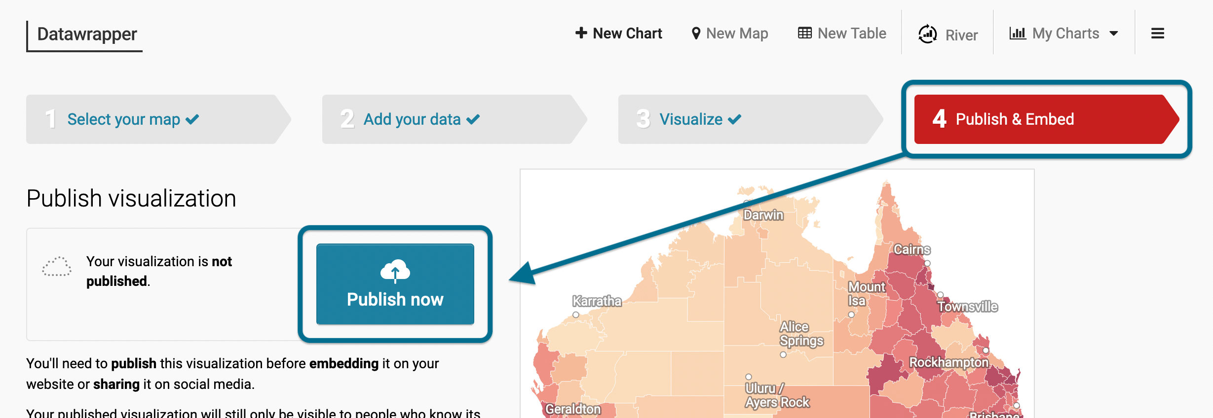 To share or embed a Datawrapper visualization in your own site, you need to publish it first. You can do in step 4: Publish & Embed of every Datawrapper table, chart, or map. Simply click on Publish now: