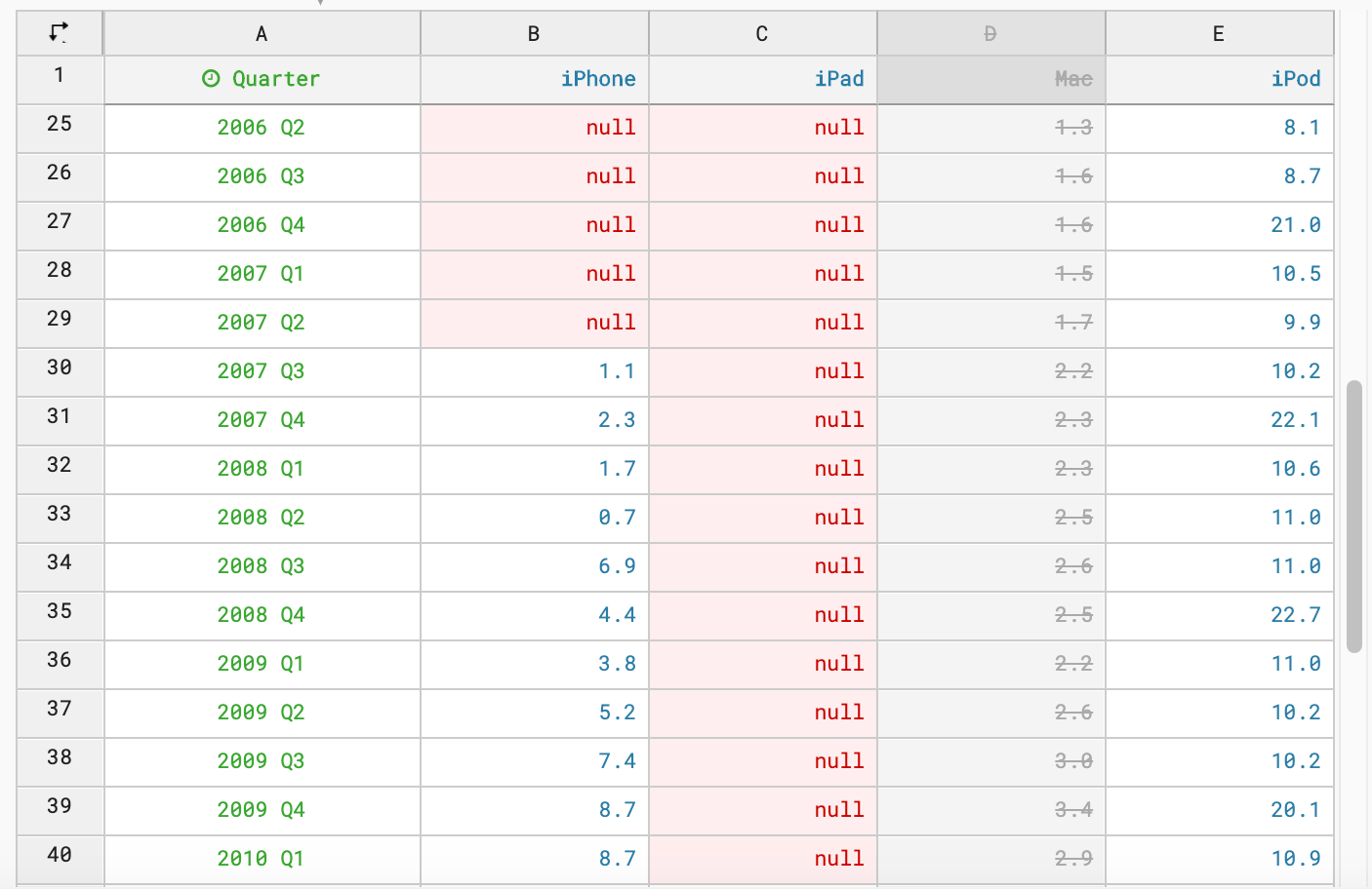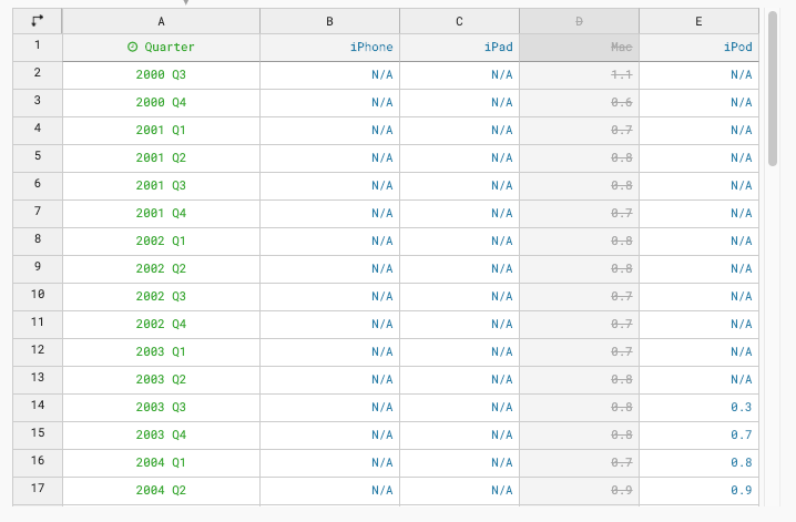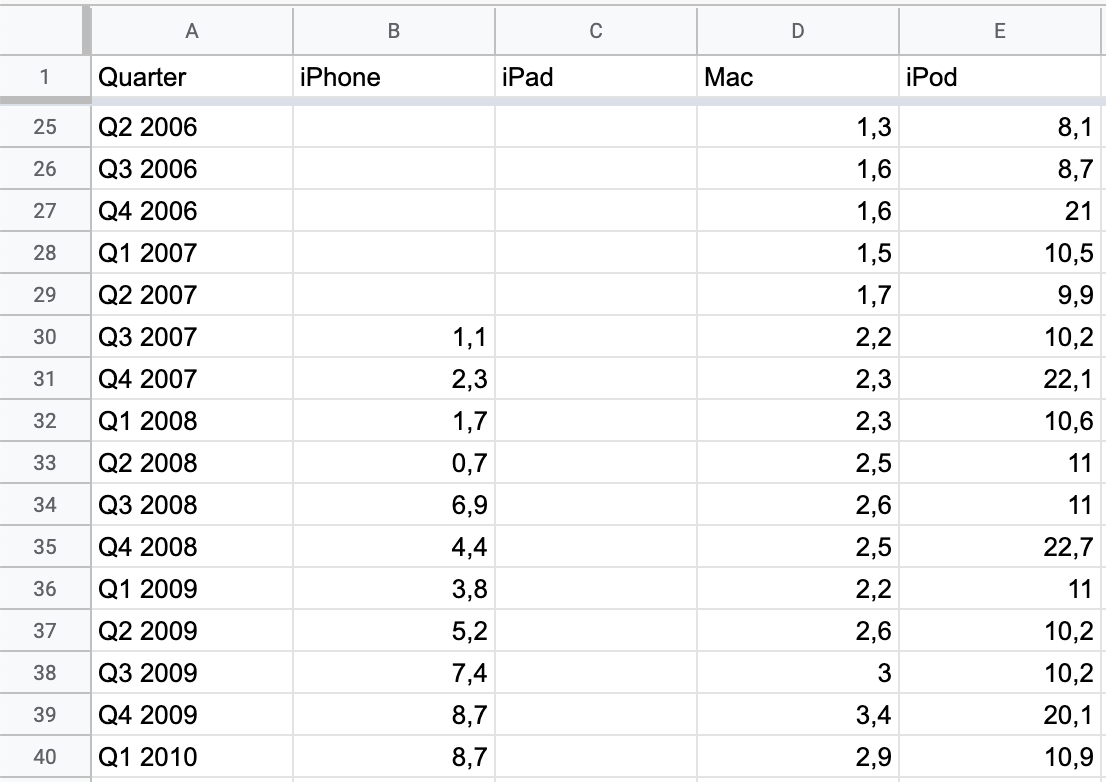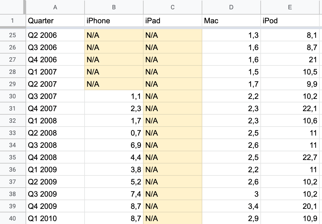 Notice the "0"s in the tooltips for iPad when tracing along 2004 - 2010: