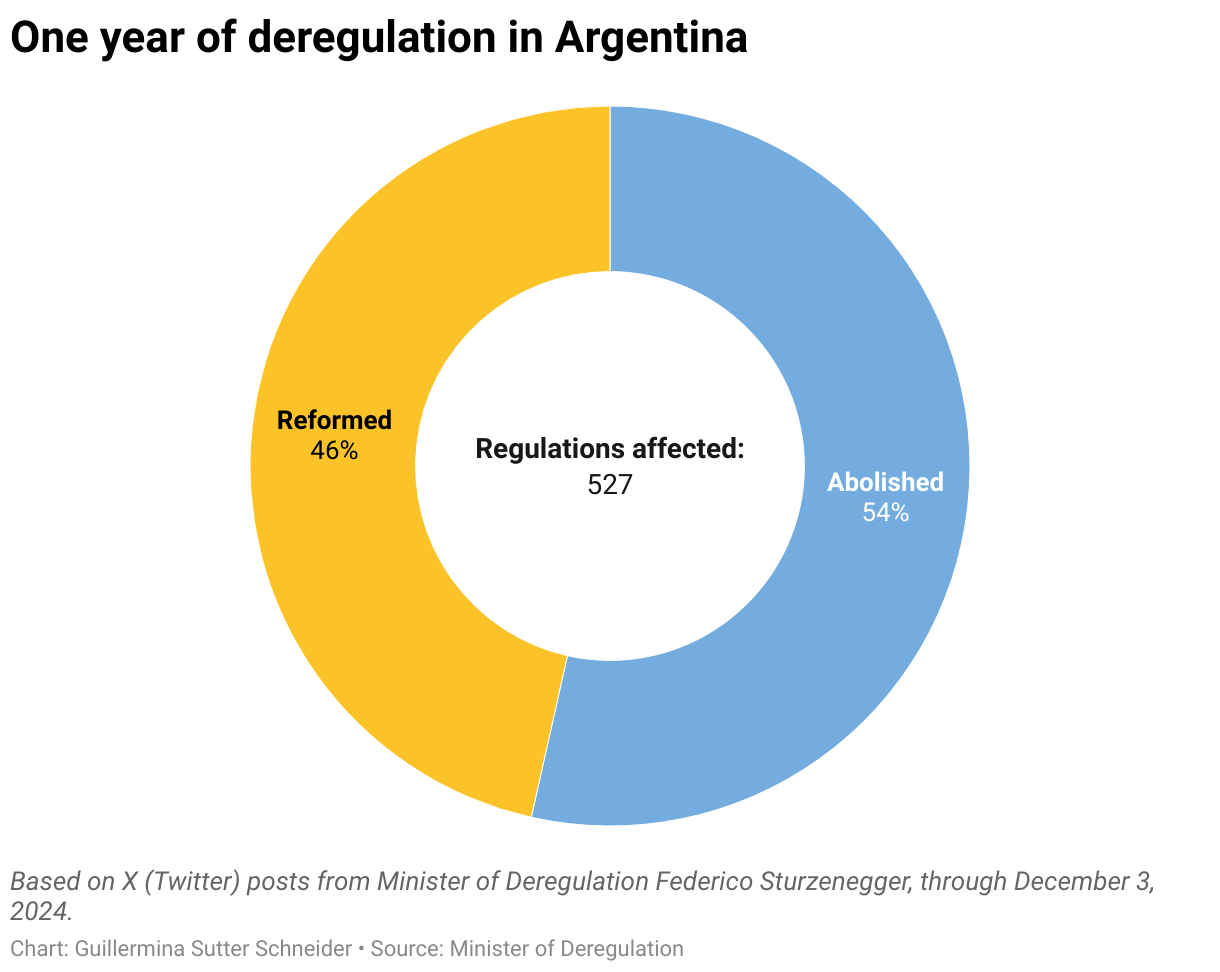 Next Tuesday will mark one year since Javier Milei became president of Argentina in the middle of that crisis. Milei campaigned on a program of deregulating the economy and significantly reducing the size of government, which he describes as "the most ambitious reforms ever undertaken in Argentina." I was curious to measure how far these deregulatory efforts have actually gone in the year since: