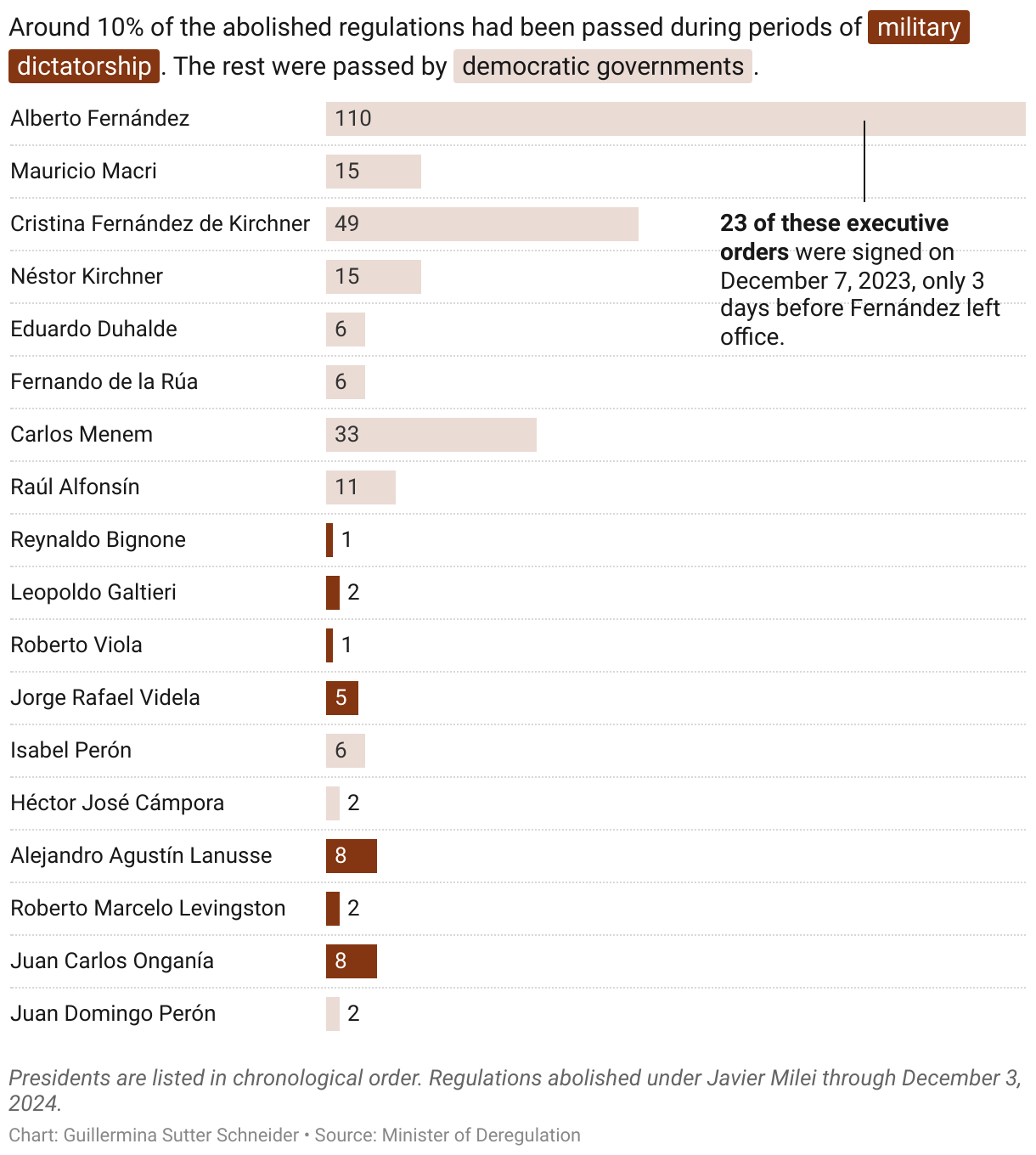 Which rules are being undone? Almost 40% of the abolished regulations had been implemented during the presidency of Alberto Fernández from 2019 to 2023, many of them signed only days before Milei himself took office.