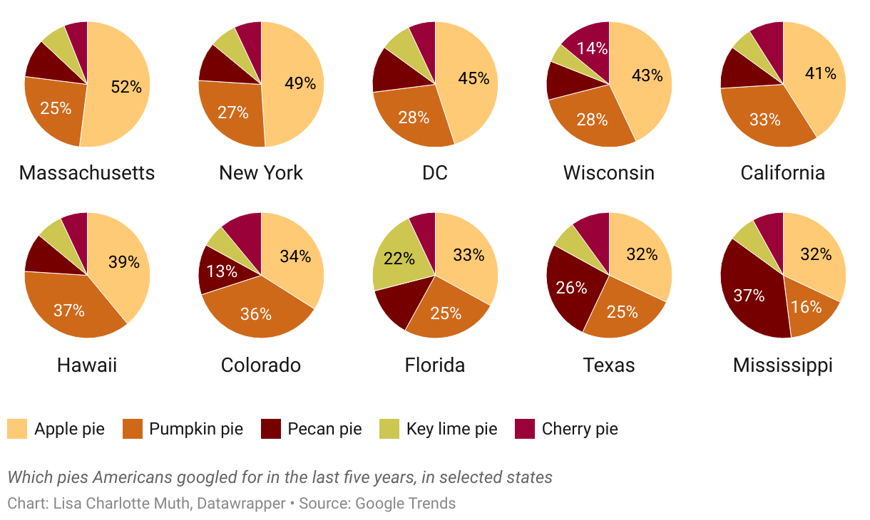“Small multiples” are a way to show the same chart type, multiple times next to each other. They’re a great way to compare if your uncle ate as big of a slice from the apple pie as he ate from the pumpkin pie. Since they’re almost a chart type on their own, we added them as such to our chart selector: You can now create small multipies and multi…um…donuts with our new chart types “Multiple Pies” & “Multiple Donuts”.
