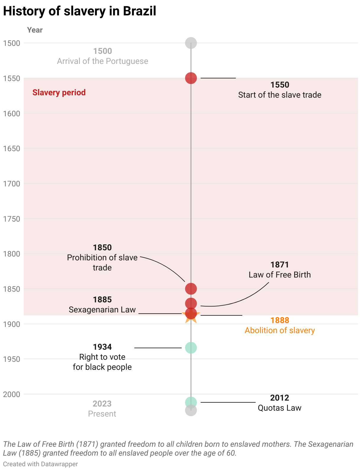 After more than 300 years, Brazil only abolished slavery in 1888, the last country in Latin America to do so, and Black people could not even vote until 1934. Although the abolition of slavery was a significant step toward ending the exploitation of people of color, it did not solve the problem of racial inequality. After slavery was abolished, the former slaves were left without land, education, or job opportunities, which left them in a state of extreme poverty and vulnerability, in most cases continuing to be enslaved in one way or another.