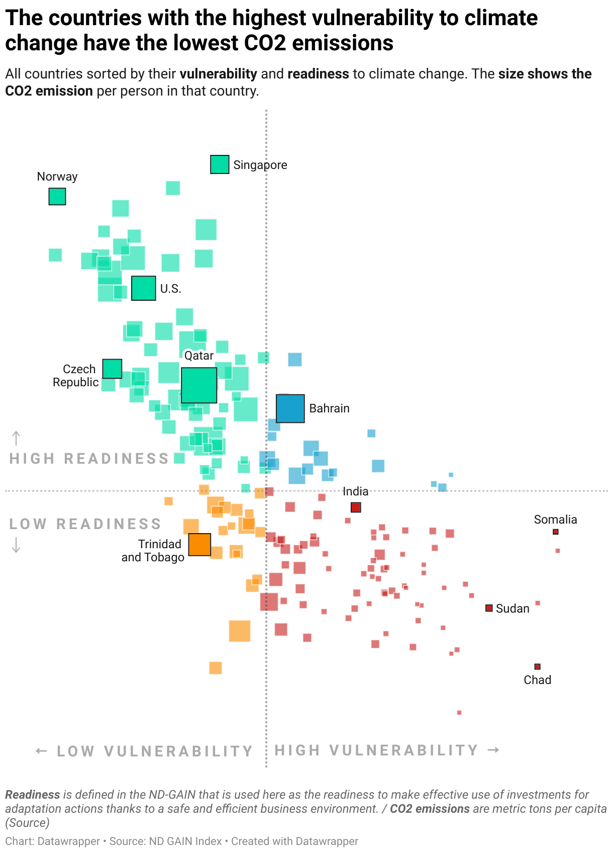 Besides the two measures from the index, I also added another dimension of data: CO2 emissions per capita. The size of each country’s square is defined by the average amount of CO2 emitted by each person who lives there. You can see that the smallest squares on the chart are in the red quadrant, mostly countries in Africa that face extreme risks from heat, drought, and fire. That means that the people in these parts of the world, who are most vulnerable to the consequences of climate change and least prepared to cope with them, are also the least responsible for causing the crisis.