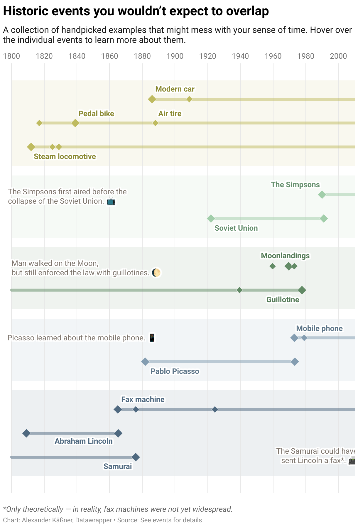 This in itself was hopefully already something new to you — it was to me! 😉 But I decided to collect a few more examples of things that, surprisingly, happened around the same time. Here are some of my favorite overlaps in (more recent) human history:
