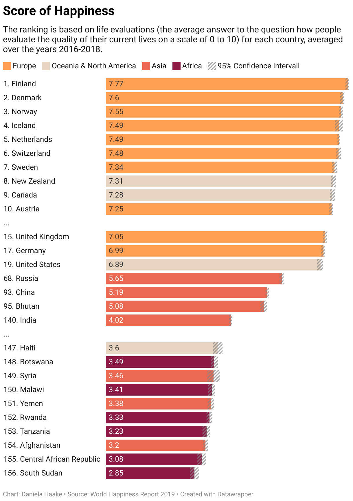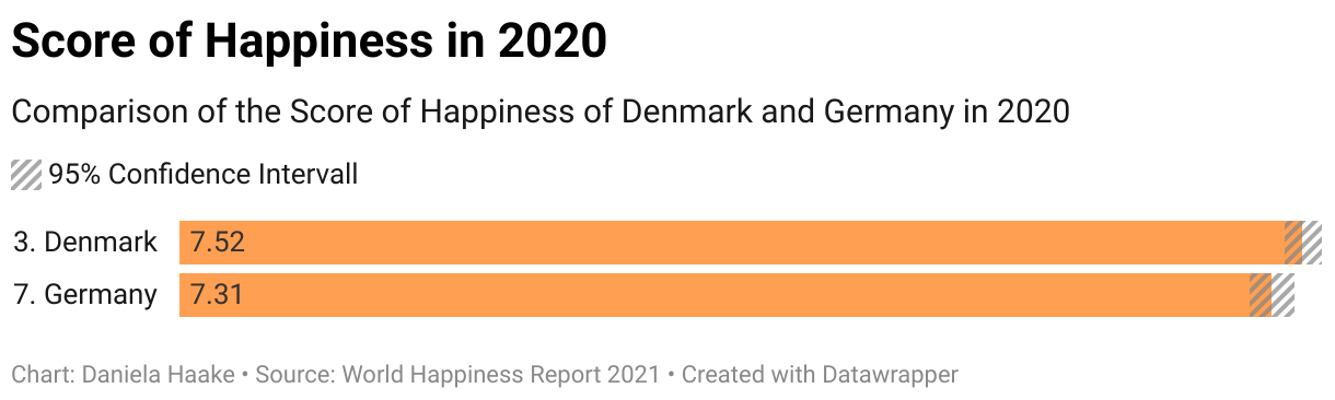 This is where the confidence interval becomes interesting. Each country's numerical score was based on a sample of 1000 people. However, this can only be an estimate of the score that would result from a survey of the whole population. Furthermore, the country rankings from the first chart show data averaged over 2016-2018, but not every country participated in the surveys in every year. And in 2021, the interviewers were faced with special challenges due to the pandemic and resulting restrictions, and were in some cases only able to conduct telephone interviews — which, in their eyes, could lead to minor inaccuracies in the 2020 results. The 95% confidence interval indicates a range of values that is likely to contain the "true" happiness score of each country. So the truth lies somewhere in between.