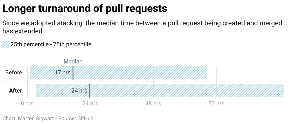 In fact, the turnaround times of pull requests have increased, from a median of 17 hours before stacking to about 24 hours after stacking, which is the time it takes for a pull request to get merged after it was first created.