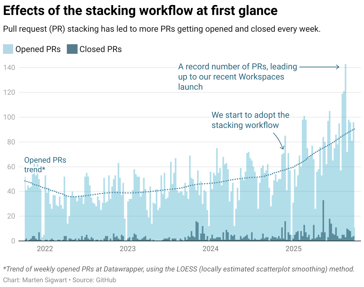 To explore how stacking has affected our contributions at Datawrapper, I looked at the number of created, merged, and closed pull requests per week. While you can see the numbers had already been growing before we adopted the new workflow (for example, because new team members joined), the number of pull requests saw a steep increase once we adopted stacking, culminating at a record high in late August of this year, as we geared up ahead of the Workspaces launch.