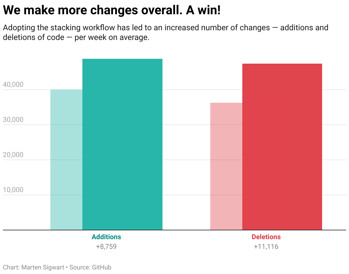 We went from around 40,000 added and 36,000 deleted lines of code per week before stacking to about 49,000 additions and 47,000 deletions after. That looks like a win to me — and it matches the feedback I’ve been hearing from my teammates too.