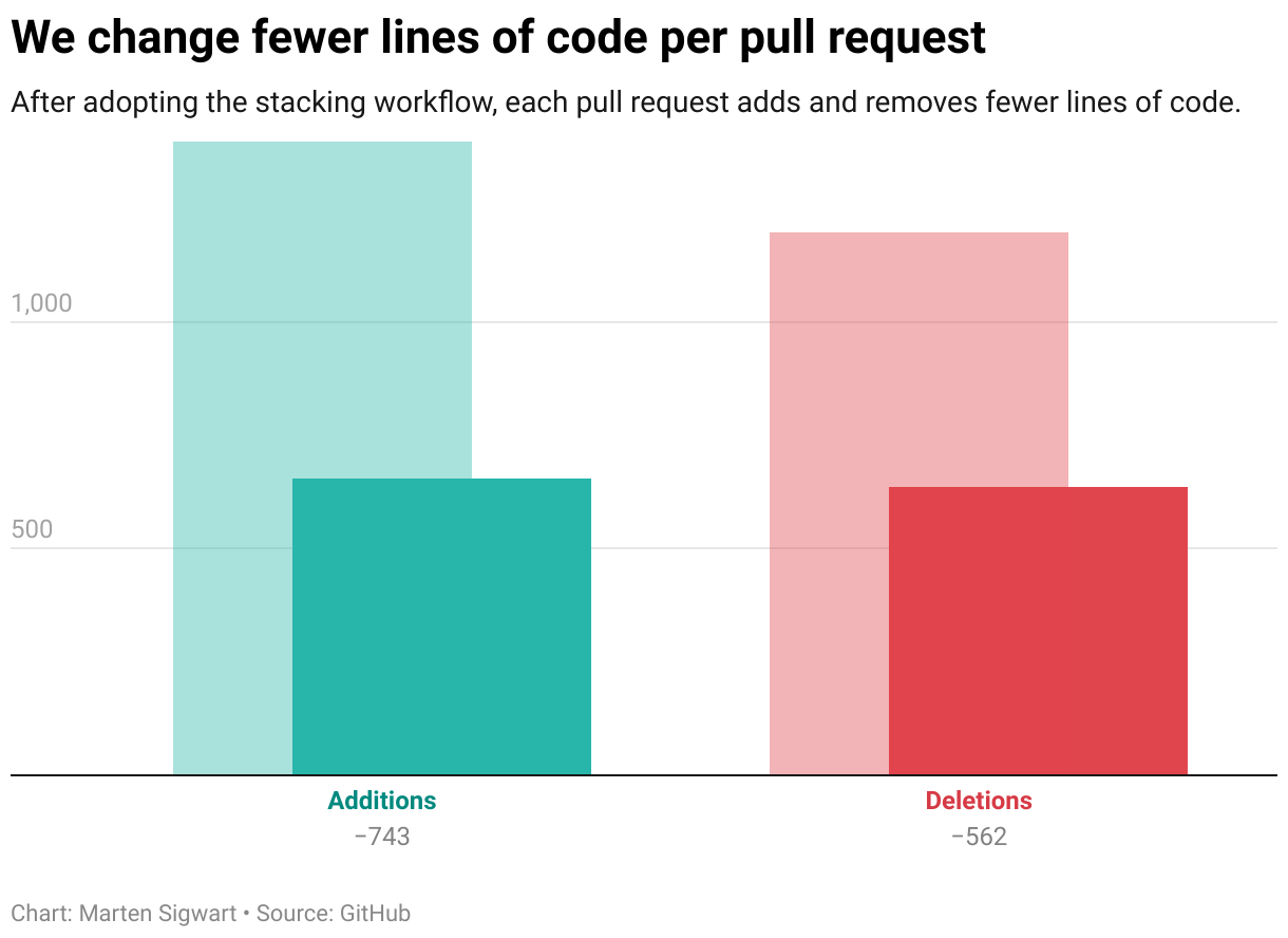 Taking a look at the average number of changes for each pull request, we can see that after adopting the stacking workflow, new pull requests add and remove fewer lines of code.