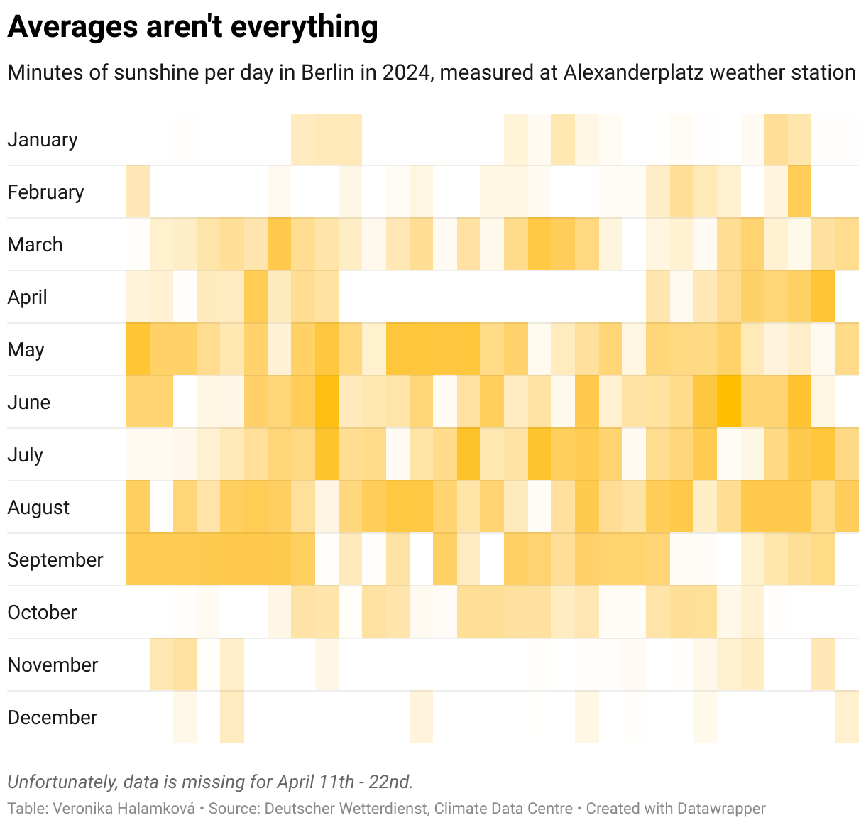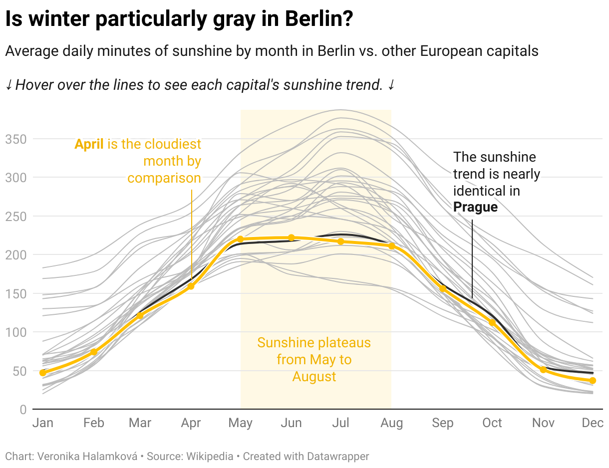 Staring out the window, I wonder what the rain is trying to tell me about my Weekly Chart choice. I decided to look into the amount of sunshine that the capital of Germany gets throughout the year. There were two reasons: it’s been quite sunny in the past few weeks — we got to see the sun, at least for a moment, nearly every day. The second reason? The dreaded Berlin winter is just ahead.