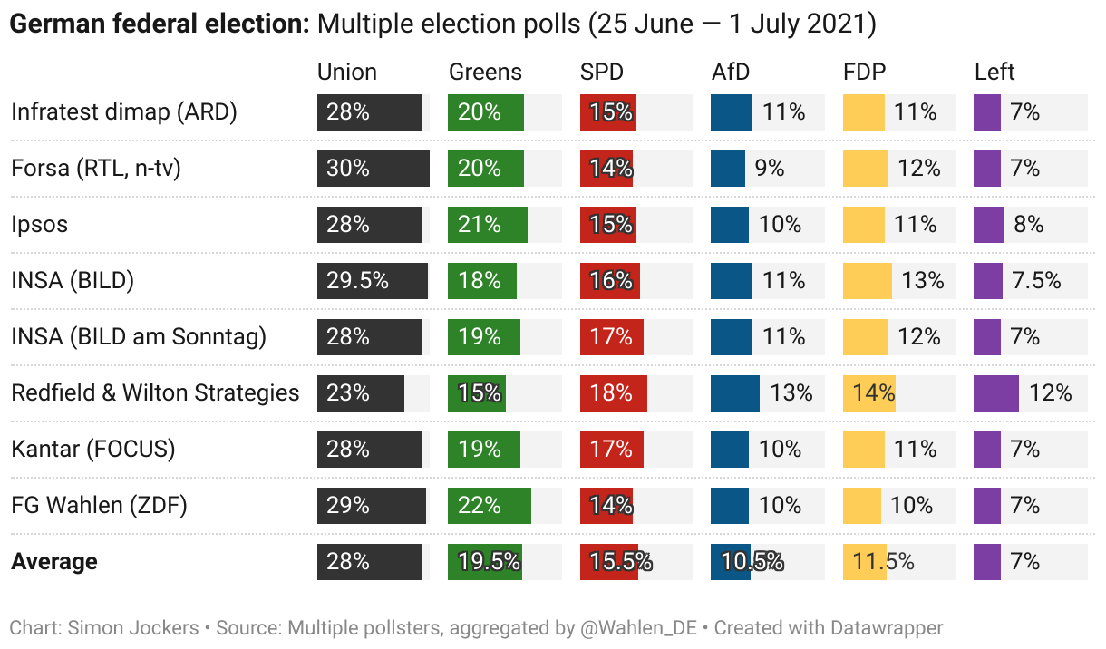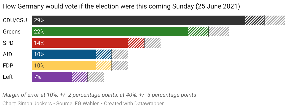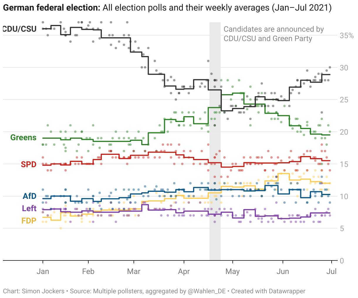 Germany, where Datawrapper is based, has an important election coming up this September. After 16 years, Angela Merkel is about to leave office and there are two likely contenders hoping to succeed her: Annalena Baerbock of the Green Party and Armin Laschet of Angela Merkel's center-right Christian Democratic Union (CDU/CSU).