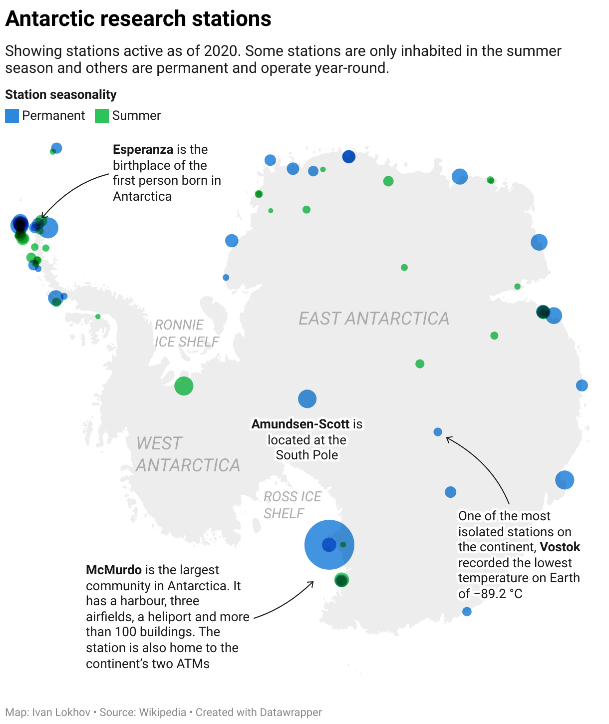 Antarctica has always fascinated me due to its remoteness, vastness, and harsh environment. In fact, it seems like I'm not the only one at Datawrapper with an interest - my colleague Anna previously published a Weekly Chart about it.