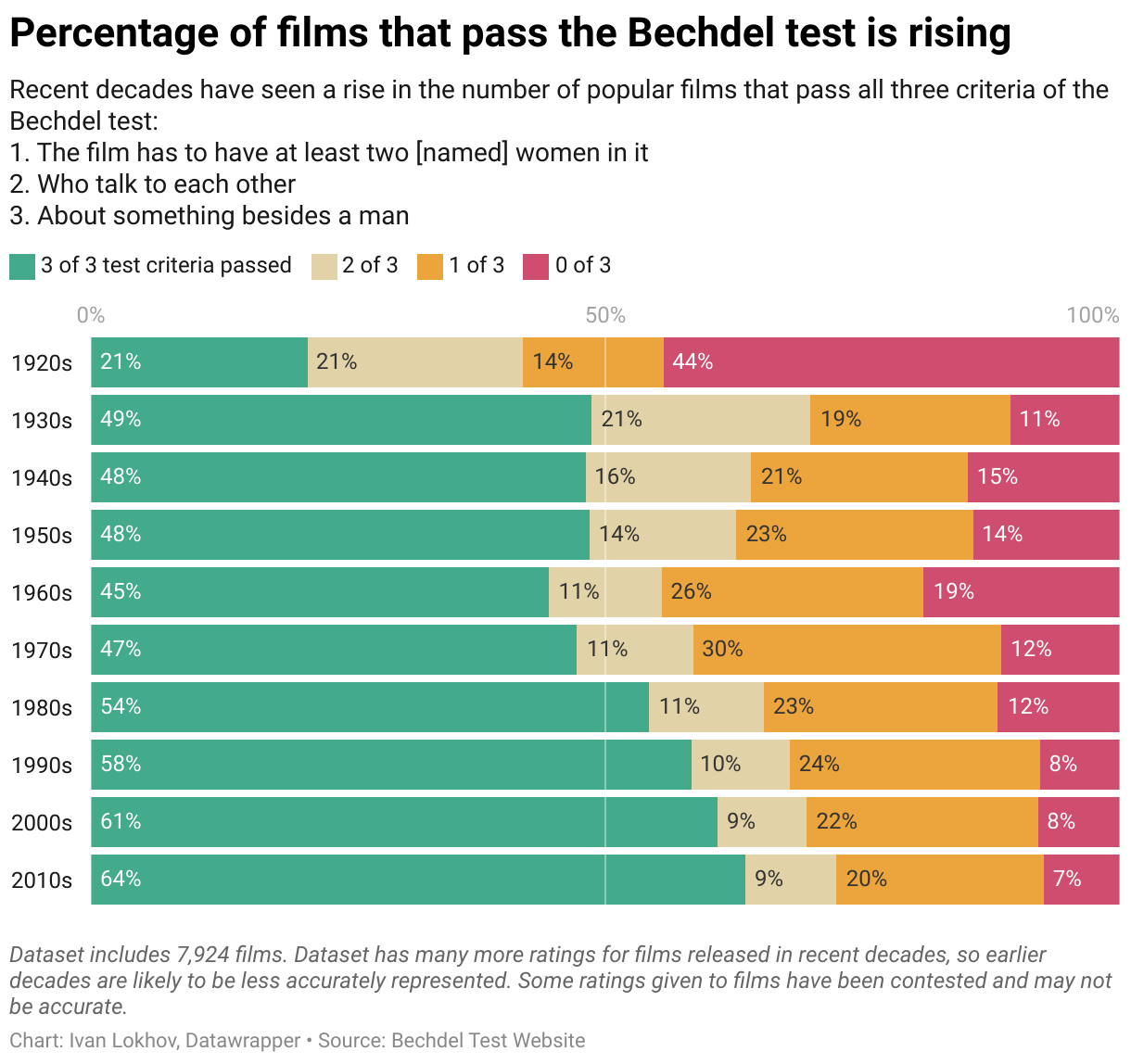 I used the humble stacked bar chart to visualise the data. Each decade is represented by a single bar. Percentage proportions corresponding to the number of Bechdel test criteria passed are clearly visible through color-coding. The stacked bar chart also makes it quick and easy to make comparisons between the decades and see the overall trend emerging over time.