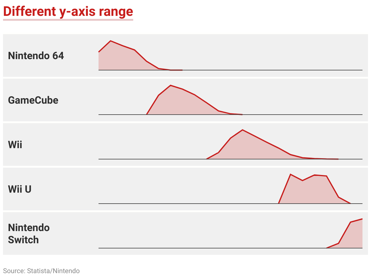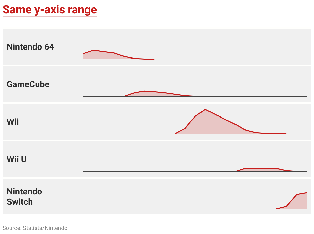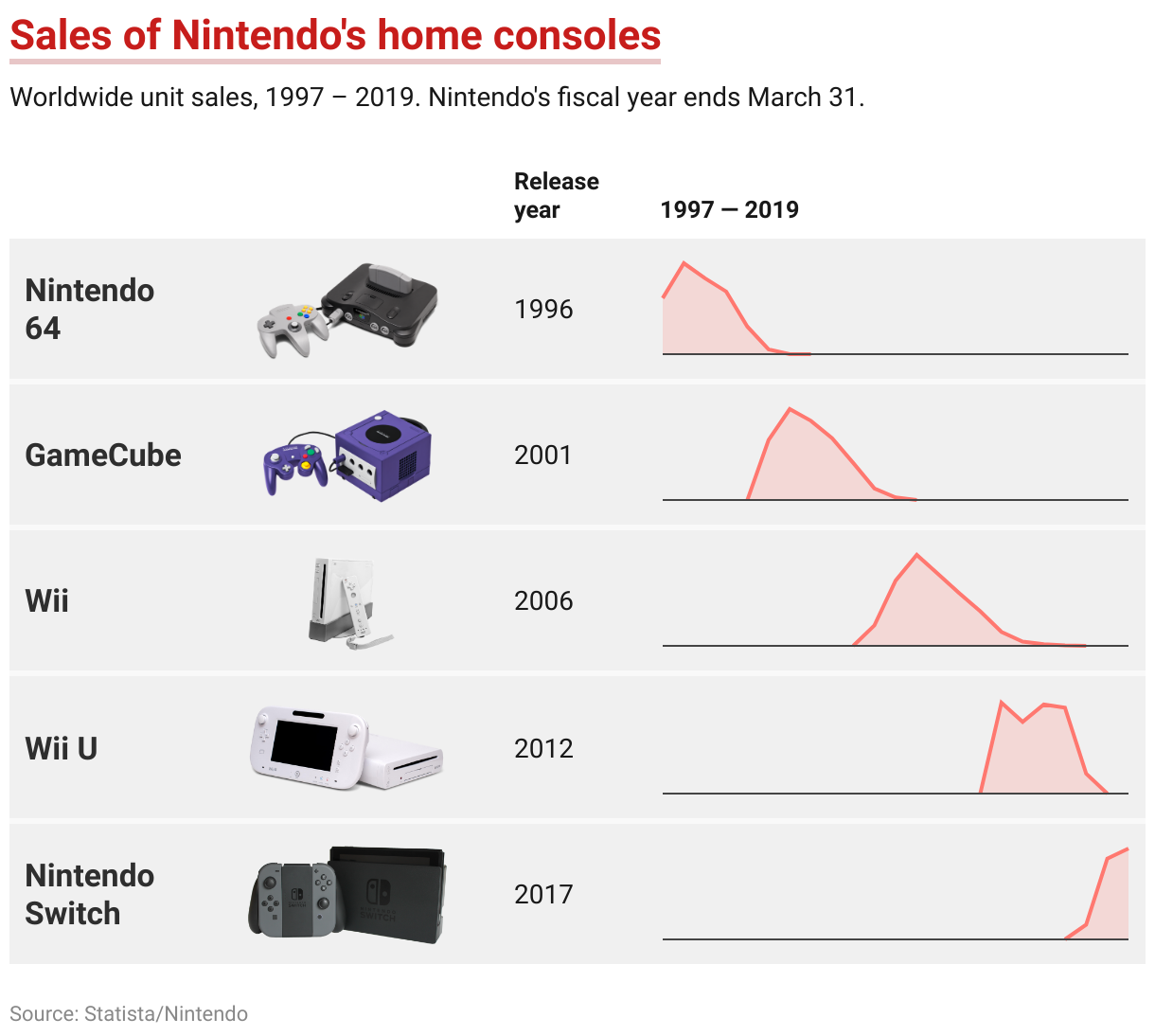 This week, I once again used our fresh table tool – and this time with sparklines; these tiny line charts in the last column. Thanks to them, we can see that the Wii was the most successful console of the five consoles shown here. In fact, the Wii was one of only three consoles that were sold more than 100 million times. The other two ones were the PlayStation and the PlayStation 2.