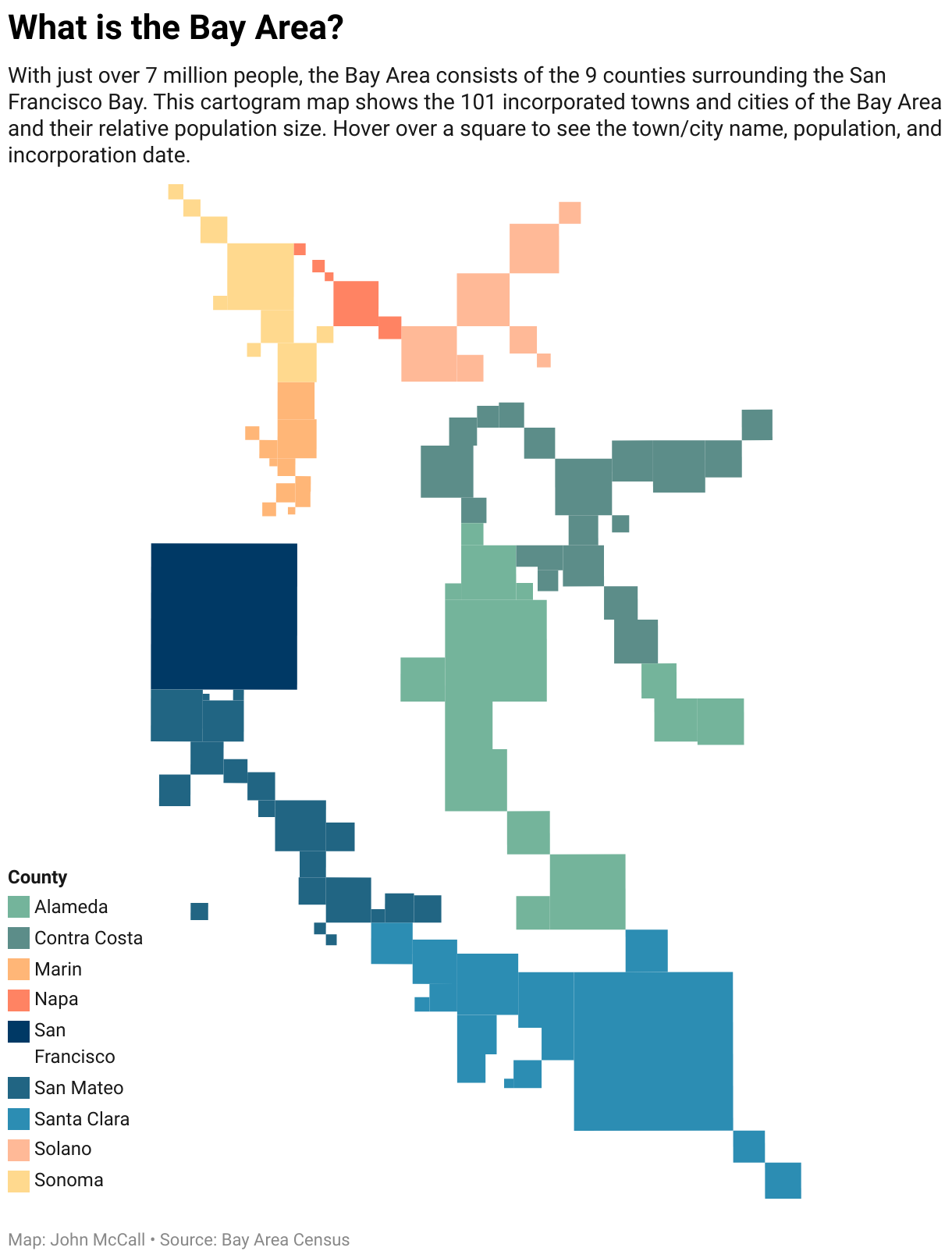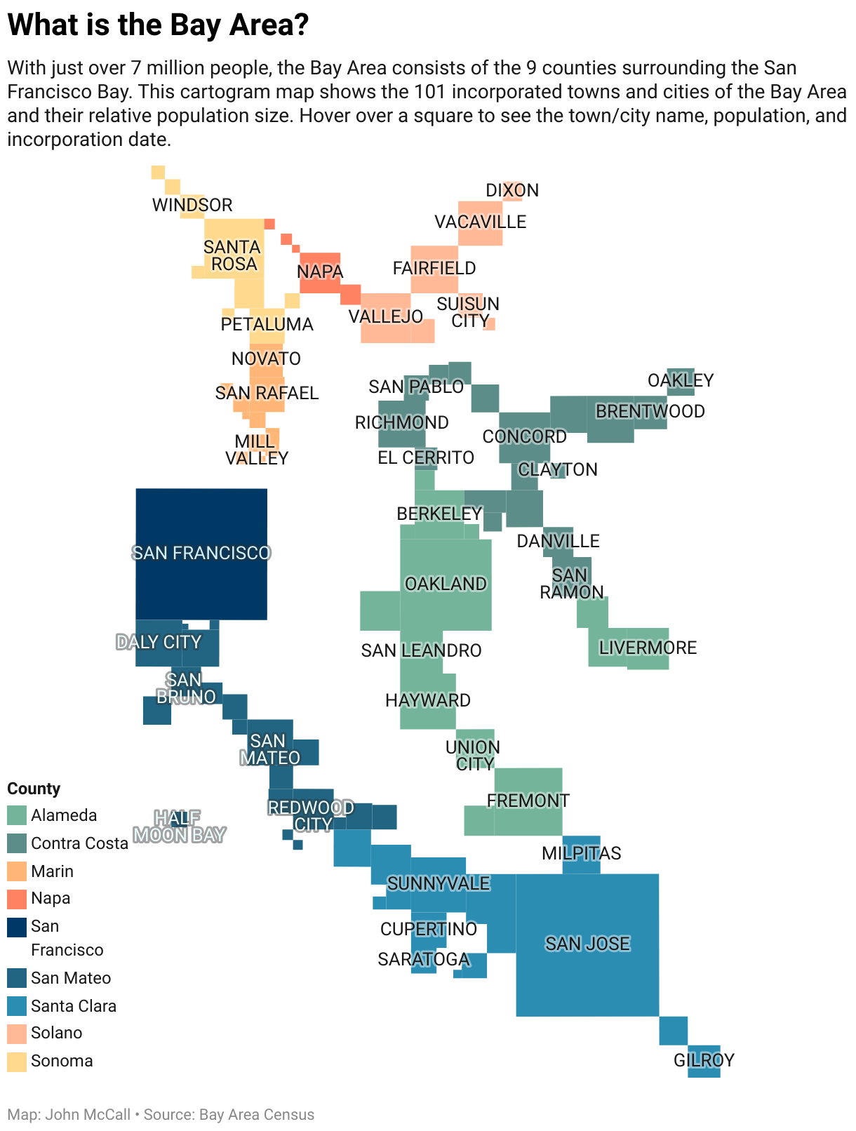 This physical map gives you a good sense for how big the Bay Area really is and the true location of the towns and cities (within the framework of this map projection, of course). But it also causes the squares to be small and far apart. That’s why I created an alternative version; a proper cartogram: