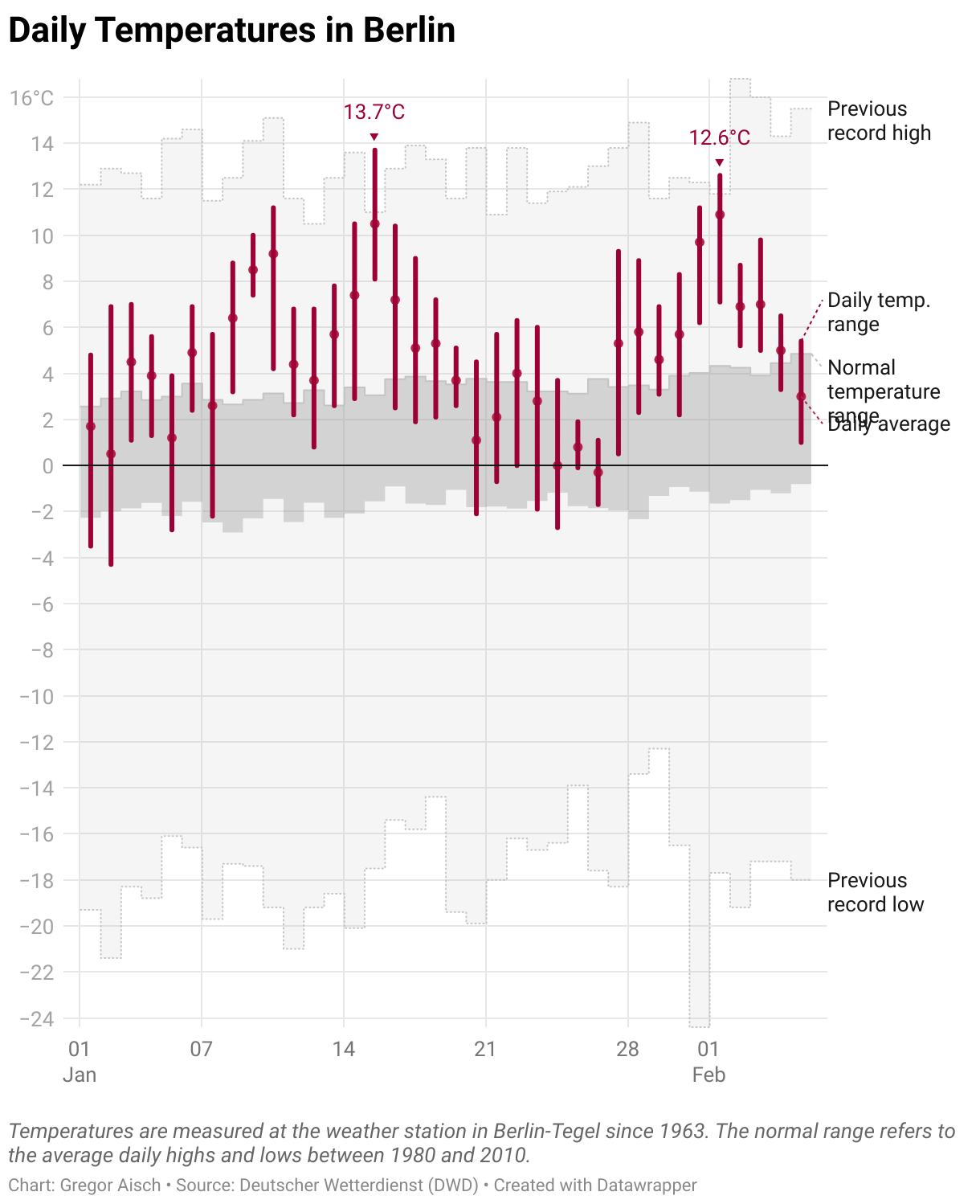 I decided to use the Datawrapper line chart to create this chart. For the normal and record ranges I used the Fill area between lines feature we added last year (here’s a quick tutorial).