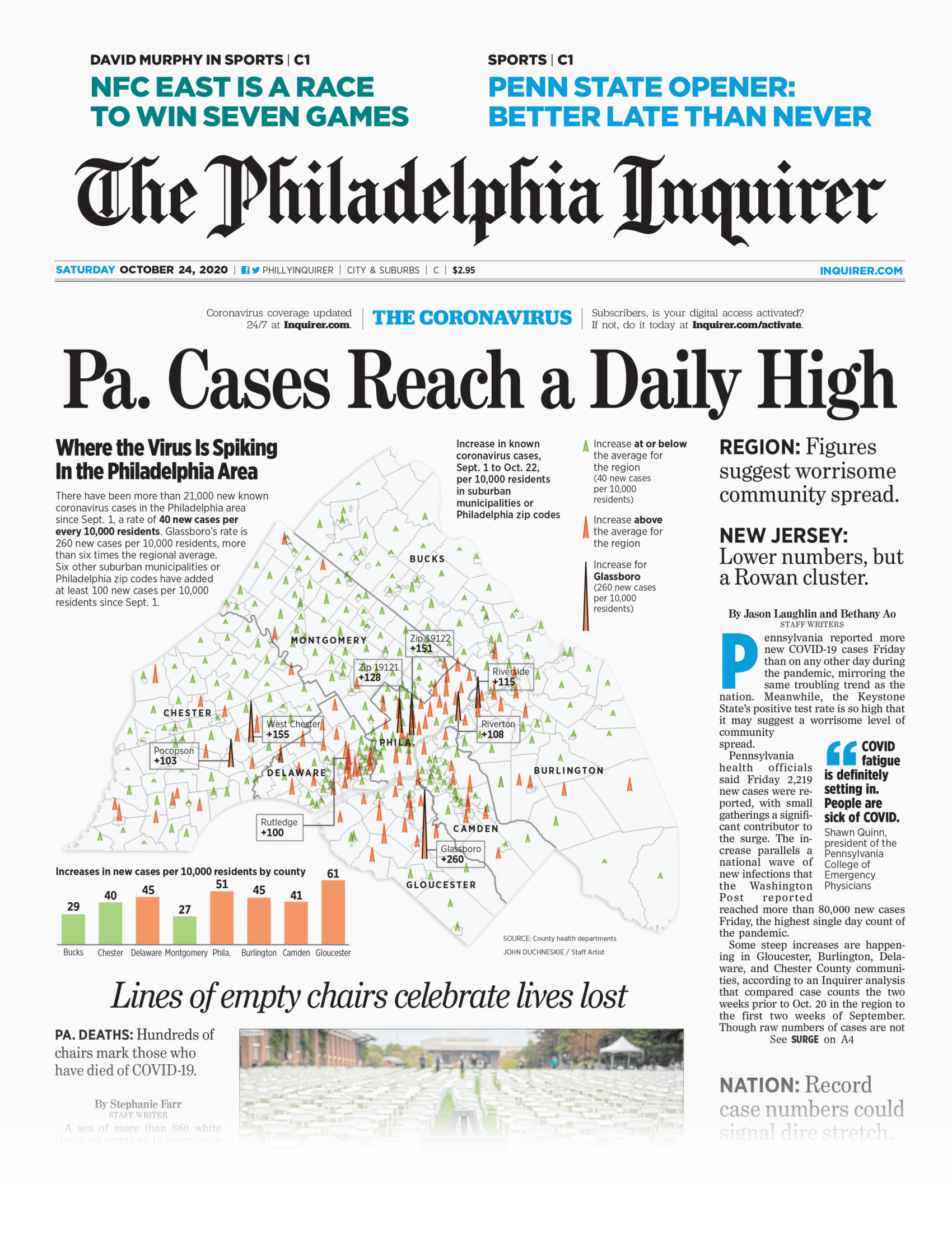 When John Duchneskie started designing print graphics at the Philadelphia Inquirer 35 years ago, his work revolved around a nightly printing schedule. “This big machinery of a large newsroom hummed and built to a crescendo late in the evening. Then we sent our files to the printer. Especially big projects had us worrying sometimes — you couldn’t recall that missile once it was published!”