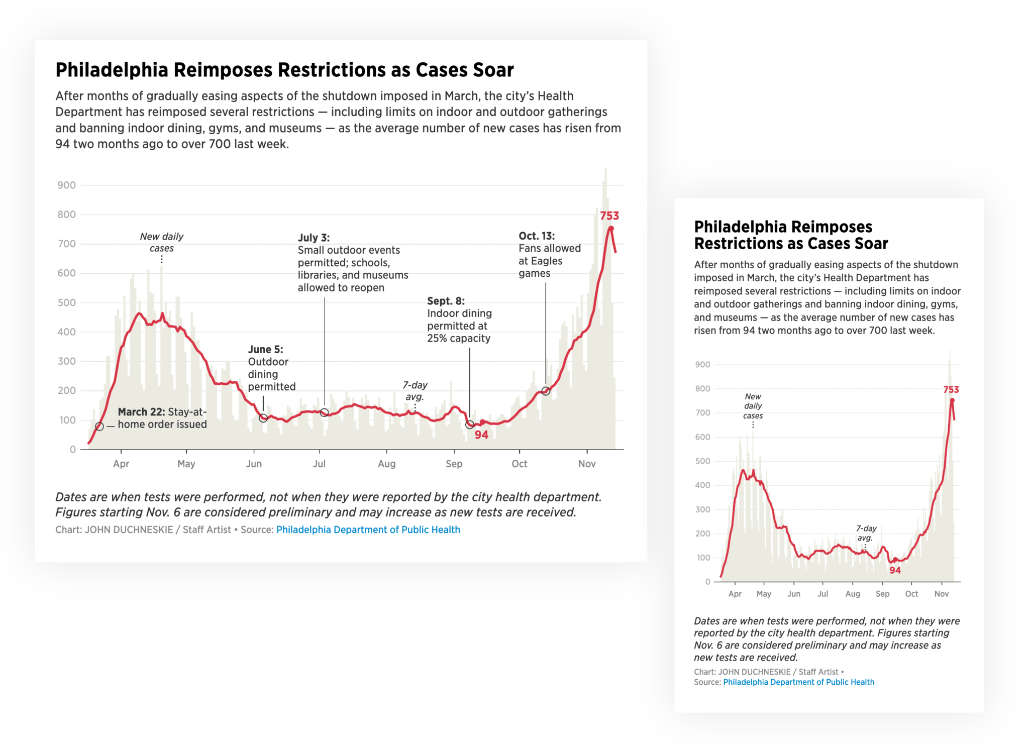 A chart by John Duchneskie, as seen on desktop devices (left) and mobile screens (right): The font size stays readable on mobile, and John decided to show fewer annotations so that they don’t overlap. It’s also possible to show these annotations as a key below the chart — learn more here.